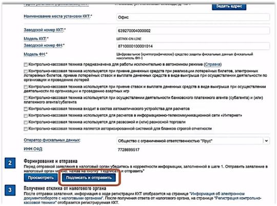 2. После регистрации в личном кабинете ФНС откройте вкладку «Учет контрольно-кассовой техники», нажмите кнопку «Зарегистрировать ККТ» и выберите «Заполнить параметры заявления вручную» и по инструкции внесите необходимые данные. 3. После заполнения заявления нажмите кнопку «Подписать и отправить». 4. Когда заявление будет обработано, появится запись, что ККТ присвоен регистрационный номер.