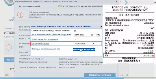 5. Для регистрации кассы необходимо внести данный номер в кассовый аппарат. На первом чеке напечатается отчет о регистрации. 6. Возвращаемся на сайт налоговой и вносим данные из кассового чека и заканчиваем регистрацию кассы.